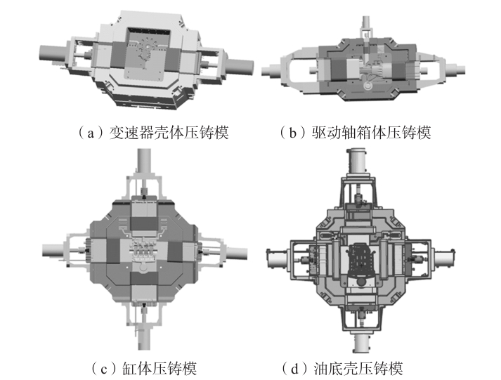 圖8 應用實例 4、結論 (1)大型壓鑄模的成形零件在保證強度和剛度的前提下,盡量按功能或工藝劃分,采用鑲拼結構。鑲塊外邊緣兩側采用斜面裝配,能夠減少模具熱膨脹導致的變形。 (2)通過優化分流錐和熔杯的結構,加大鑄件料餅部位的冷卻,能夠降低生產節拍,提高效率。 (3)大型壓鑄模采用方導柱導套,在動靜模受熱條件不同的情況下,能夠保證模具導向精度。 (4)液壓抽芯機構采用雙油缸能夠保證大尺寸的滑塊運行平穩,采用復合油缸能夠提高滑塊的運行速度,從而提高生產效率。 (5)局部增壓機構能夠有效解決鑄件熱節處的縮孔,可以設置在模具動靜模或滑塊上。