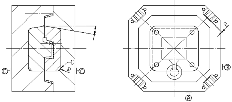 圖1 鑲塊結構 (3)對成形尺寸和形狀等結構特殊處,采用鑲拼結構,有利于模具局部強制冷卻方案的實施,并有利于型腔排氣。 (4)對大規格尺寸的型腔采用鑲拼結構,可以降低加工難度,防止型腔開裂、變形等缺陷。 2.1.2 動定模塊外形結構 模具在連續生產過程中,型腔溫度會高于套板的溫度,會導致成形模塊膨脹量大于套板膨脹量,而套板和型腔采用H7/g6的配合間隙無法抵御熱膨脹的變化,模具就會產生熱變形。型腔模塊尺寸越大,變形量就越大。為解決此問題,型腔模塊外形采用圖2結構,相鄰兩直面做定位基準面,另相鄰兩面制作成斜面,鑲塊受熱膨脹后,分型面水平方向的膨脹量可以通過垂直方向來釋放,可以有效地解決模板膨脹變形的問題,一般α取6°。同時,在成形模塊外形設計時,模塊四周和底面采用大圓角過渡,以保證套板的強度不被破壞。