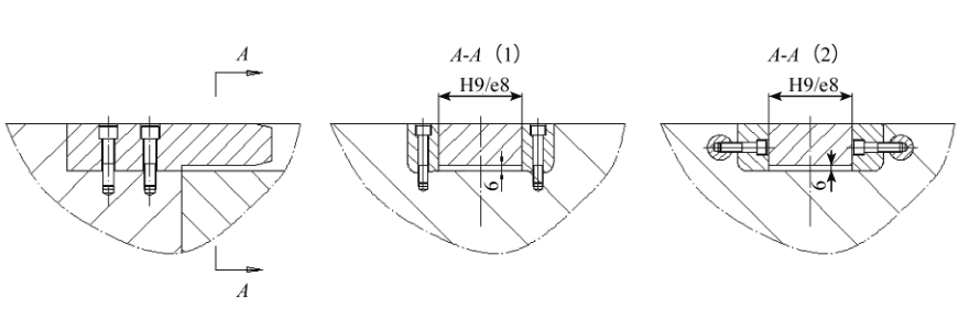 圖2 鑲塊與套板的裝配 2.2 方形導柱導套 對于大型模具而言,由于導柱導套布置在模具的邊緣中心距較大,在動靜模受熱條件不同的情況下,其膨脹量有差異,如果采用圓形導柱導套,在模具溫度升高變化時,導柱導套就會發生異響甚至表面拉傷,從而影響模具配合精度。因此,大型模具采用方形導柱導套結構,在熱膨脹小的方向采用H9/e8的滑動配合,熱膨脹大的方向采用2 mm間隙。因模具溫度場是以型腔為中心呈放射狀向外輻射,所以方導柱導套的布置一般在模具套板的四角,方向和間隙值確定見圖3。