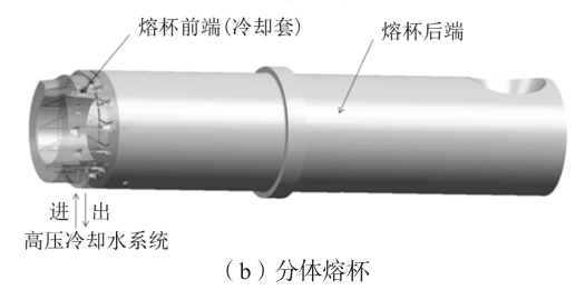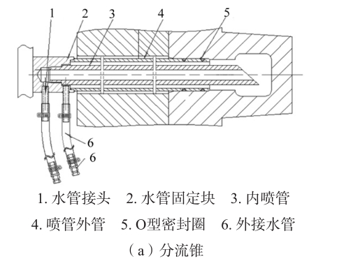 圖3 方形導柱導套結構 2.3 分流錐和熔杯的設計 大型模具料缸直徑較大,要保證增壓壓力有效的傳遞,還需要料餅有足夠的厚度。由于大體積的料餅與鑄件的冷卻速度不匹配,導致留模時間延長,生產節拍加長,而且經常在開模取件時,出現料餅爆裂現象,因此必須加大分流錐和熔杯的冷卻,才能有效縮短料餅的冷卻時間,提高生產效率。圖4所示為優化后的分流錐和熔杯結構。 2.3.1 分流錐結構 在大型壓鑄模中盡量設計分流錐,這樣可以減小熔杯的長度及壓射沖頭的推出行程。分流錐內部加工成大空穴,加大冷卻水通道體積,根據強度計算保證單邊壁厚>25 mm。冷卻水采用單點獨立噴管式水冷卻方式,不銹鋼水管內壁進水,外壁回水,并加大進出水管的直徑(截面積),保證足夠的冷卻水流量,以實現快速冷卻。冷卻水回水端在模具外接流量閥,生產試制時用紅外線攝像機監控分流錐處的模具溫度,根據模具溫度調整回水端的流量閥,最后鎖定冷卻水流量的管理值。批量生產中,通過監控冷卻水的流量值來保證分流錐冷卻的穩定性。 2.3.2 熔杯結構 熔杯采用兩體式結構,熔杯前端長度只滿足料餅的高度即可,這樣既有利于在熔杯前端布置冷卻水加快料餅的冷卻,又能保證一體式料缸的優點,壓射沖頭運行穩定可靠。 熔杯前端用專用夾具在加工中心上沿孔周邊加工出V型孔(如圖4),加大了冷卻水通道的長度和表面積;熔杯后端采用常規的冷卻水通道。冷卻水的調整和使用方法同上。