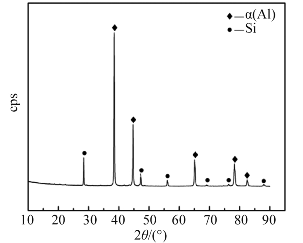 根據(jù)熱傳導(dǎo)的物理規(guī)律,在進(jìn)行熱傳導(dǎo)時(shí)物體內(nèi)部的溫度場會(huì)隨時(shí)間發(fā)生變化,這使得直接測量熱導(dǎo)率有一定困難。本文在測量合金的密度、比熱容以及熱擴(kuò)散系數(shù)的基礎(chǔ)上,采用式(1)計(jì)算出合金的熱導(dǎo)率 2、鋁合金ZL102壓鑄組織 濾波器殼體由鋁合金ZL102壓鑄而成,由表1得出合金中硅含量為12.8%(質(zhì)量分?jǐn)?shù),下同),該成分接近鋁硅二元合金共晶成分(Al-Si二元平衡相圖中共晶成分點(diǎn)Si含量為12.6%),合金凝固時(shí)主要發(fā)生共晶反應(yīng)L→α(Al)+β(Si),形成大量的α(Al)+ Si共晶組織。然而,由于壓鑄工藝下合金冷卻速率高,凝固過程遠(yuǎn)離平衡態(tài),因此鋁合金ZL102室溫下壓鑄組織中存在的物相包括初生α(Al)、鋁硅共晶組織、初晶硅以及少量的金屬間化合物。如圖2顯示了采用OM得到的壓鑄件表層及心部顯微組織,其中灰白色的基體為初生α(Al),在基體之間分布有大量灰黑相間的鋁硅共晶組織,以及針狀/板條狀的初晶硅。對比圖2a與圖2b,表層組織更加細(xì)小均勻,這是由于壓鑄件在成形時(shí)表層直接接觸模具型壁,合金冷卻速率高、過冷度大,使得表層組織中晶粒更加細(xì)小均勻。此外,壓鑄件心部組織中還發(fā)現(xiàn)了少量大塊的灰色多邊形組織,如圖2b所示,由于合金成分中含鐵量稍高,初步判斷其為某含鐵物相。采用X射線衍射(XRD)測試合金物相組成,掃描范圍為10°~90°,掃描速度為4°/min,將測試結(jié)果導(dǎo)入MDI Jade 6進(jìn)行分析,結(jié)果如圖3所示。由XRD檢測結(jié)果可知,合金中只存在α(Al)與Si相,并未檢測到含鐵金屬間化合物等,造成上述情況的原因可能是合金中金屬間化合物的含量較低,導(dǎo)致XRD并未檢測到。