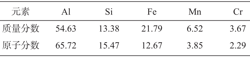 圖3 壓鑄鋁合金ZL102的XRD圖譜 采用SEM進(jìn)一步對上述多邊形物相進(jìn)行分析,如圖4所示。基于能譜儀(EDS)結(jié)果(表2),推測其為一種復(fù)雜的AiSiFeMn四元金屬間化合物。結(jié)合部分文獻(xiàn)如袁、王等判斷該物相為α-Al 15 (Mn、Fe) 3 Si 2 ,該物相是在β-Al 5 FeSi 相基礎(chǔ)上加入Mn元素后進(jìn)一步演變而成。在β-Al 5 FeSi 相形成時(shí),部分Mn原子奪去了Fe原子在β相中占據(jù)的位置,相當(dāng)于Mn原子部分替代Fe原子,從而形成了AlSiFeMn四元復(fù)合相。