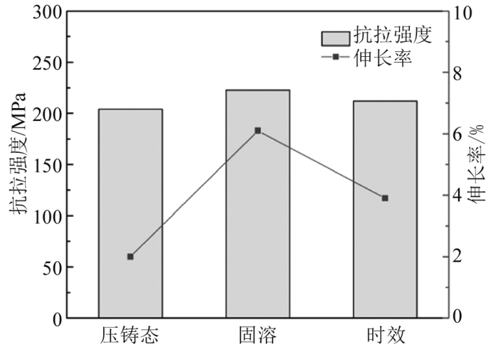 圖5 壓鑄態(tài)、固溶及時(shí)效組織的對比分析 4、熱處理對力學(xué)性能及導(dǎo)熱性能的影響 不同熱處理工藝下的壓鑄鋁合金ZL102力學(xué)性能如圖6所示,可以看到,在強(qiáng)度與伸長率方面,固溶處理后的試樣優(yōu)于壓鑄態(tài)及時(shí)效處理的試樣,其抗拉強(qiáng)度與伸長率分別為222.8 MPa與6.1%,相比壓鑄態(tài)抗拉強(qiáng)度提高了9.2%,伸長率得到明顯改善,提高了205%,而時(shí)效態(tài)的試樣力學(xué)性能居中。分析原因,盡管已有研究認(rèn)為,由于氣孔的存在普通壓鑄件不適合進(jìn)行熱處理,且鋁合金ZL102為非熱處理強(qiáng)化合金,但固溶處理過程中硅相的熔斷和球化顯著改善了其對α(Al)基體的割裂作用,減少了合金承載時(shí)在周圍產(chǎn)生的應(yīng)力集中,有利于合金強(qiáng)度及伸長率的提高。進(jìn)一步時(shí)效處理,合金力學(xué)性能相比固溶態(tài)反而發(fā)生了一定的下降,其原因在于α(Al)晶界及固溶體中析出的硅相進(jìn)一步聚集長大發(fā)生粗化現(xiàn)象,損害了合金的力學(xué)性能,且合金時(shí)效過程中并沒有析出時(shí)效強(qiáng)化相。