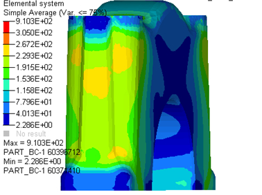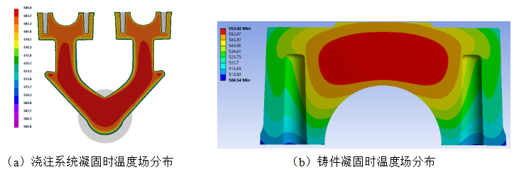 圖6 充型仿真結(jié)果 經(jīng)產(chǎn)品結(jié)構(gòu)優(yōu)化及澆注系統(tǒng)優(yōu)化設(shè)計(jì),保證該零件在半固態(tài)壓鑄充型之后實(shí)現(xiàn)順序凝固,即最后充型位置、零件、澆注系統(tǒng)依次凝固,這樣有利于實(shí)現(xiàn)充型之后的高壓補(bǔ)縮,提高產(chǎn)品致密度,消除縮孔縮松缺陷,溫度場(chǎng)分布仿真結(jié)果見(jiàn)圖7。