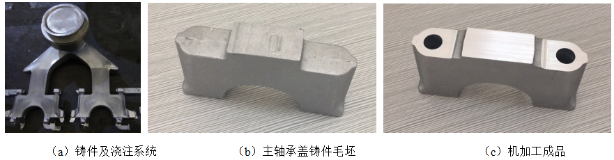 圖7 溫度場(chǎng)分布結(jié)果 3、鋁合金主軸承蓋鑄件試制 319S漿料通過(guò)旋轉(zhuǎn)熱焓平衡法(SEED法)制備,通過(guò)調(diào)整金屬熔體的澆注溫度、金屬坩堝旋轉(zhuǎn)速度和旋轉(zhuǎn)時(shí)間等制備固相率約45%的半固態(tài)坯料。產(chǎn)品在BUHLER 840T壓鑄機(jī)上試制,模具材質(zhì)為H13鋼。鑄件要求無(wú)裂紋、欠鑄、疏松、氣泡和任何穿透性缺陷,熱處理后不允許出現(xiàn)過(guò)燒組織。 結(jié)合鑄造工藝CAE模擬和現(xiàn)場(chǎng)壓鑄試驗(yàn),優(yōu)化工藝參數(shù)為:慢速速度為0.15~0.25 m/s,二快速度為0.3~0.5 m/s,開(kāi)始?jí)毫?4~36 MPa,建壓時(shí)間為0.02 s,工作壓力90~105 MPa,保壓時(shí)間為30 s。試制樣件見(jiàn)圖8,主軸承蓋毛坯質(zhì)量為180 g,機(jī)加后成品質(zhì)量為159 g,相比原鑄鐵件減重130 g,減重比例45%。