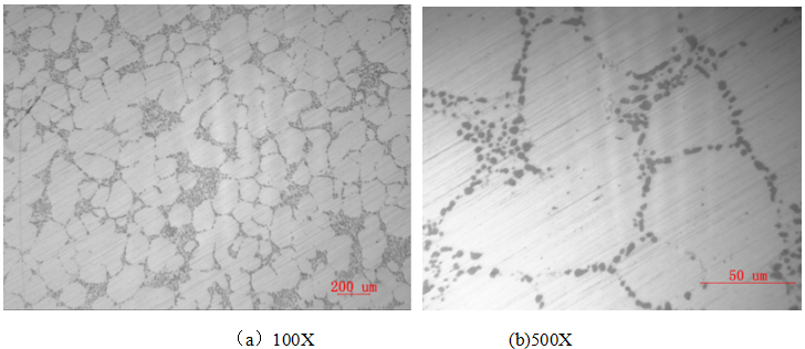 表4 鑄件取樣拉伸試驗(yàn)結(jié)果 從主軸承蓋上取樣,熱處理后金相組織見(jiàn)圖9,可以看出,α-Al相呈球狀,變質(zhì)正常,分布均勻,通過(guò)截線法計(jì)算晶粒大小為109.8 μm。共晶Si顆粒較為圓整,并均勻分布在初生α-Al晶界處,無(wú)針狀或大塊硅顆粒;平均Si顆粒尺寸小于8.0 μm,最大Si顆粒尺寸小于10.0μm。