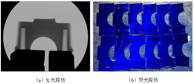 圖9 半固態(tài)鋁合金主軸承蓋熱處理金相組織 對(duì)鑄件進(jìn)行X光探傷和熒光探傷檢驗(yàn),結(jié)果顯示鑄件無(wú)氣孔、縮松等缺陷,符合要求,見(jiàn)圖10。