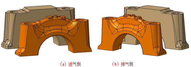圖1 半固態(tài)鋁合金主軸承蓋設(shè)計(jì)優(yōu)化過(guò)程 通過(guò)擴(kuò)大排氣側(cè)的加強(qiáng)筋,并在進(jìn)氣側(cè)增加加強(qiáng)筋,解決了鋁合金主軸承蓋靜強(qiáng)度不足的問(wèn)題,結(jié)構(gòu)特征見(jiàn)圖2;增高主軸承蓋的螺栓孔周?chē)膶?shí)體,增高量為5 mm,使鋁合金主軸承蓋相對(duì)滑移量達(dá)到設(shè)計(jì)要求;將兩螺栓孔之間填滿(mǎn)實(shí)體,見(jiàn)圖3,以提高零件剛度及疲勞性能,同時(shí)保證充型過(guò)程中漿料平穩(wěn)順序地由厚壁充型至薄壁區(qū)域,增強(qiáng)凝固時(shí)的高壓補(bǔ)縮效果。