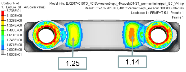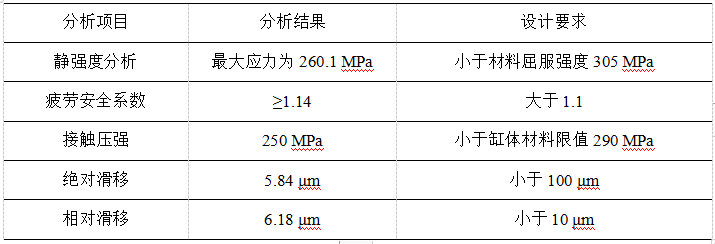 圖3 鋁合金主軸承蓋與鑄鐵主軸承蓋 對(duì)優(yōu)化后的最終數(shù)模采用ABAQUS軟件進(jìn)行靜強(qiáng)度、接觸壓強(qiáng)、絕對(duì)滑移與相對(duì)滑移仿真計(jì)算,采用FEMFAT軟件MAX模塊進(jìn)行疲勞安全系數(shù)仿真計(jì)算,結(jié)果見(jiàn)表2,發(fā)現(xiàn)均滿(mǎn)足設(shè)計(jì)要求。其中,靜強(qiáng)度應(yīng)力最大值小于材料屈服強(qiáng)度(見(jiàn)圖4),疲勞安全系數(shù)大于1.1(見(jiàn)圖5),滑移量小于限值。