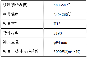 圖5 主軸承蓋疲勞安全系數(shù)(最薄弱處) 2、鋁合金主軸承蓋鑄造工藝仿真分析及優(yōu)化 為保證半固態(tài)壓鑄件順利成形,需要綜合考慮半固態(tài)金屬充型、凝固和脫模等問(wèn)題。半固態(tài)漿料是非牛頓流體,其流動(dòng)特性和凝固特性與常規(guī)壓鑄漿料不同,具有剪切變稀的特性。為獲得良好的半固態(tài)壓鑄件,充型過(guò)程中漿料前沿應(yīng)保持平穩(wěn)順序充型,漿料內(nèi)部應(yīng)為層流充型,凝固過(guò)程中應(yīng)保證良好補(bǔ)縮,避免出現(xiàn)熱節(jié)。 對(duì)鑄件開(kāi)展鑄造工藝CAE仿真分析。鑄件為一模兩件,模具材料設(shè)置為H13鋼,鑄件材料設(shè)置為自定義數(shù)據(jù)庫(kù)的半固態(tài)319S材料,主要物理性質(zhì)包括密度、熱膨脹系數(shù)、固相分?jǐn)?shù)、粘度等,均是溫度變化的函數(shù)。主要模擬參數(shù)見(jiàn)表3。