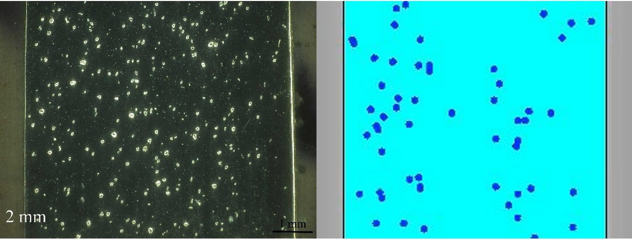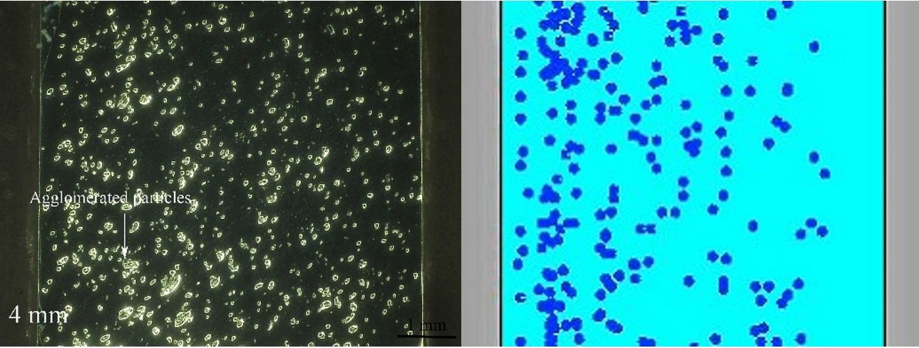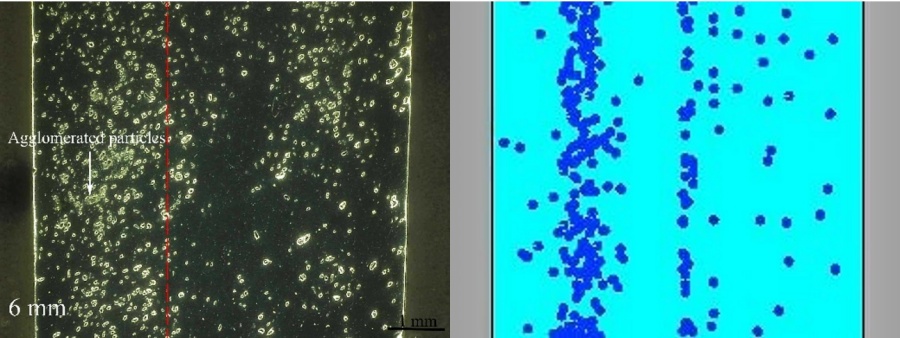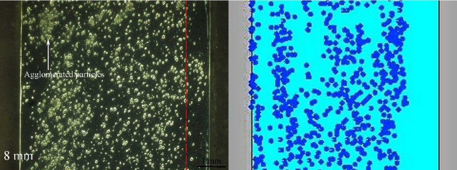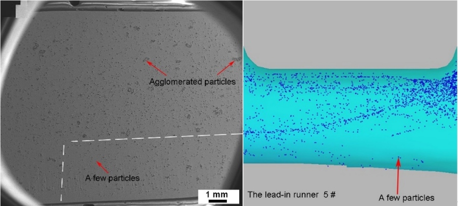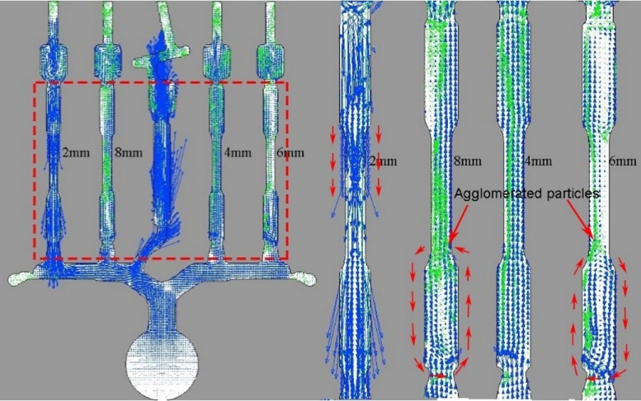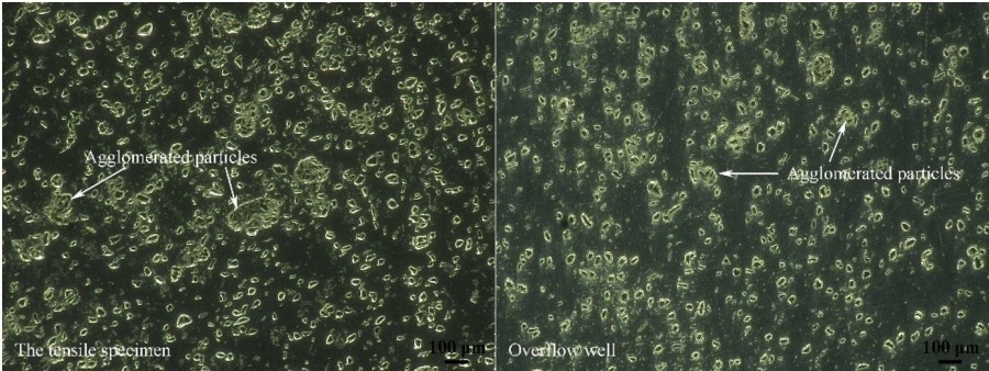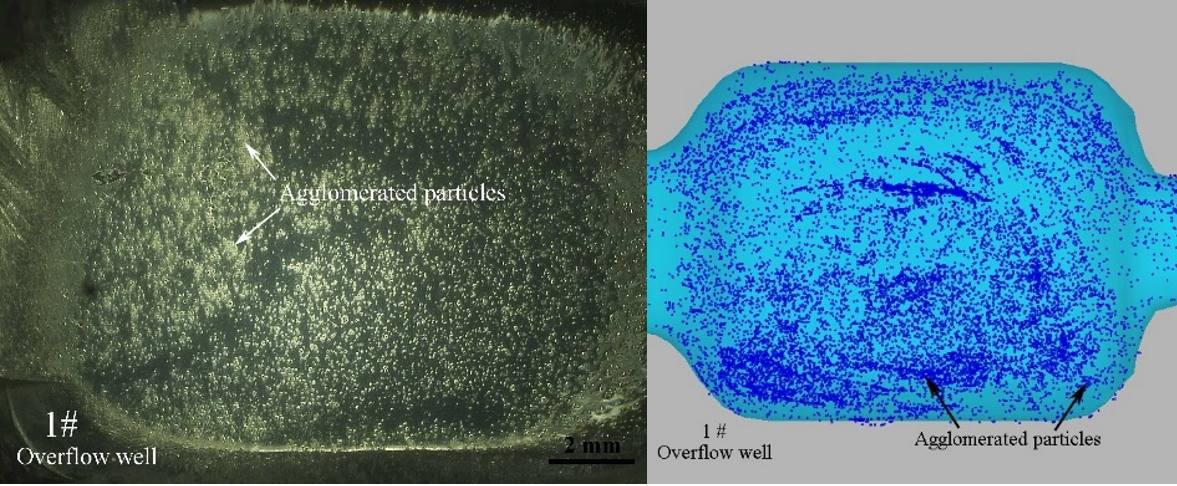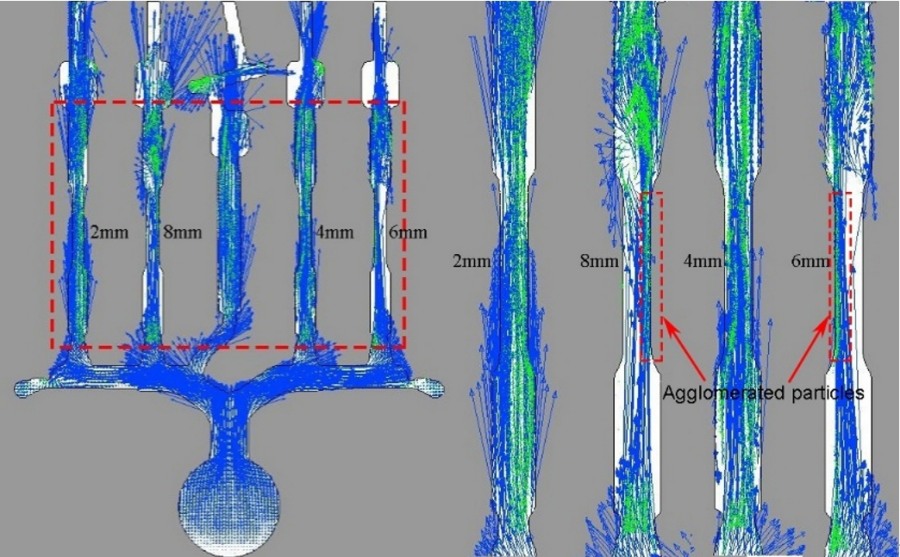 (4)2mm厚試件中熔體流向與流速變化較大,不利于顆粒沉降,導(dǎo)致試件中顆粒數(shù)量稀少;厚4mm試件中熔體流動平穩(wěn),有利于顆粒發(fā)生沉降及分布均勻;厚6mm和8mm試件易產(chǎn)生單側(cè)流和局部環(huán)流,導(dǎo)致顆粒分布不均及及團聚現(xiàn)象。 |