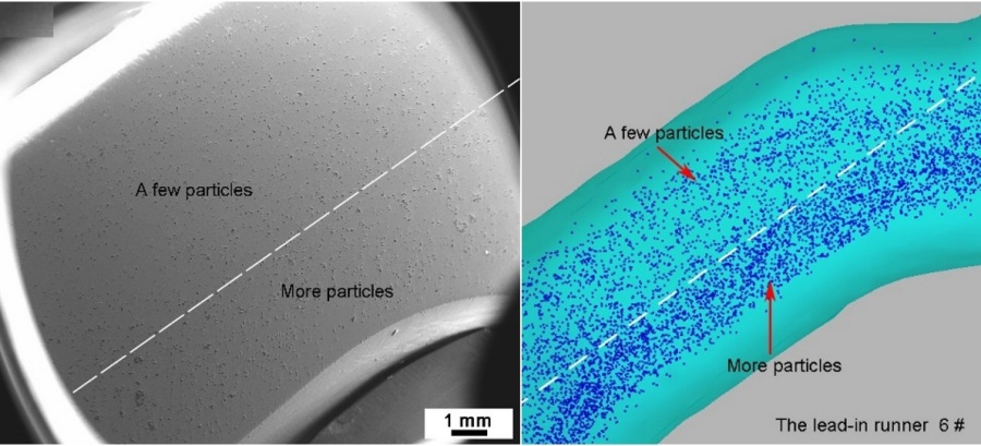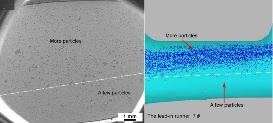 (e)實際壓鑄壓室 (f)模擬壓室 圖5為壓鑄試樣與模擬的分流道中顆粒分布對比。由圖5a和圖5b可見,鑄件分流道位置4處顆粒數(shù)量較多,且存在明顯的顆粒團聚現(xiàn)象,與模擬相符合。由圖5c和圖5d可見,鑄件 分流道位置5處顆粒數(shù)量較少,且右下方出現(xiàn)顆粒空白區(qū)域,這不同于文獻所描述的靠近型壁兩側(cè)附近均出現(xiàn)顆粒稀少現(xiàn)象。由圖5e~圖5h可見,鑄件分流道位置6和7處顆粒數(shù)量較多,且顆粒分布存在嚴重的分布不均現(xiàn)象,具體表現(xiàn)為位置6處上側(cè)顆粒數(shù)量較少,而下側(cè)顆粒數(shù)量較多,位置7處與位置6處的顆粒分布特征正好相反。上述對比分析表明,溢流槽和分流道中不同位置處的顆粒分布特征均存在較大差異,而研究充型過程中熔體的流動形態(tài)方可解釋上述現(xiàn)象。