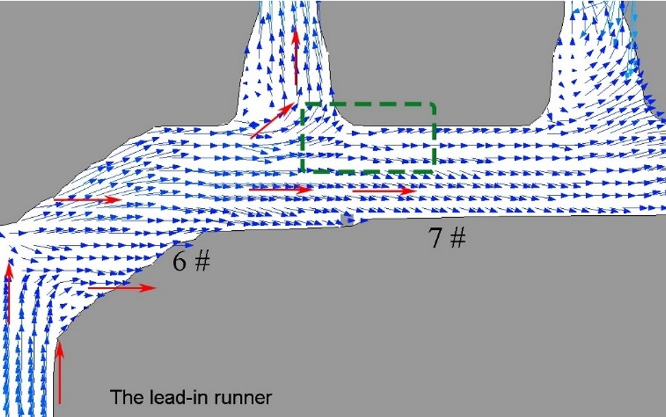 (g)實際位置7 (h)模擬位置7 圖6為數(shù)值模擬充型過程中不同位置處的速度矢量。由圖6a可見,溢流槽1和2處均形成了局部環(huán)流如圖中箭頭所示,由式(2)~(6)可知充型過程中顆粒所受的外力中流體作用力最大,且主要取決于流體的速度,速度越大時流體對顆粒的作用力也越大。因此,顆粒將伴隨熔體做環(huán)流運動,受流速變化的影響發(fā)生碰撞的幾率增大,從而易產(chǎn)生團聚現(xiàn)象,導(dǎo)致溢流槽1和2處顆粒團聚明顯(見圖4a~圖4d)。但在不同溢流槽中,顆粒的分布形態(tài)仍然存在明顯差異,這是由于溢流槽1形成了1處局部環(huán)流,而溢流槽2形成了2處局部環(huán)流,從而增大了顆粒碰撞幾率。由圖6b可見,分流道末端位置4處的熔體流速較小,截面縮收處出現(xiàn)逆向流并形成了局部環(huán)流,導(dǎo)致顆粒進入后被截留,該區(qū)域顆粒數(shù)量較多,并作環(huán)流運動產(chǎn)生碰撞團聚(見圖5a和圖5b)。同時,由圖6b可見,分流道位置5處,出現(xiàn)正向流和逆向流的交匯區(qū)域(方框標記處),顆粒被流體推擠與拖拽而發(fā)生分布不均現(xiàn)象(見圖5c和圖5d)。由圖6c可見,熔體流經(jīng)分流道位置6處時,與左上側(cè)型壁發(fā)生碰撞,熔體流向發(fā)生直角轉(zhuǎn)變,從而將顆粒推向分流道右下側(cè),導(dǎo)致顆粒分布不均(見圖5e和圖5f)。熔體流經(jīng)分流道位置6處后產(chǎn)生了分流,兩股分流的中間區(qū)域熔體流速較小且流向穩(wěn)定(方框標記處),顆粒容易在此中間區(qū)域發(fā)生淤堵與沉降現(xiàn)象,導(dǎo)致分流道位置7處顆粒分布不均,顆粒數(shù)量上側(cè)多而下側(cè)少(見圖5g和圖5h)。結(jié)果表明,復(fù)合材料壓鑄充型過程中形成的流場,對增強顆粒的分布具有重要影響,局部環(huán)流易導(dǎo)致顆粒發(fā)生碰撞團聚,而熔體流向發(fā)生劇烈變化易導(dǎo)致顆粒分布不均現(xiàn)象。