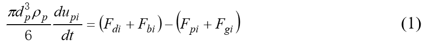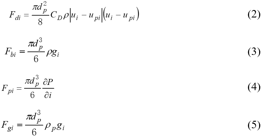 式中,dp為顆粒的粒徑,ρp為顆粒的密度,upi為顆粒的運動速度,F(xiàn)di為顆粒所受的流體流動作用力,F(xiàn)bi為顆粒受到的浮力,F(xiàn)pi為顆粒受到的流體壓力梯度力,F(xiàn)gi為顆粒受到的重力作用力,具體計算如下: