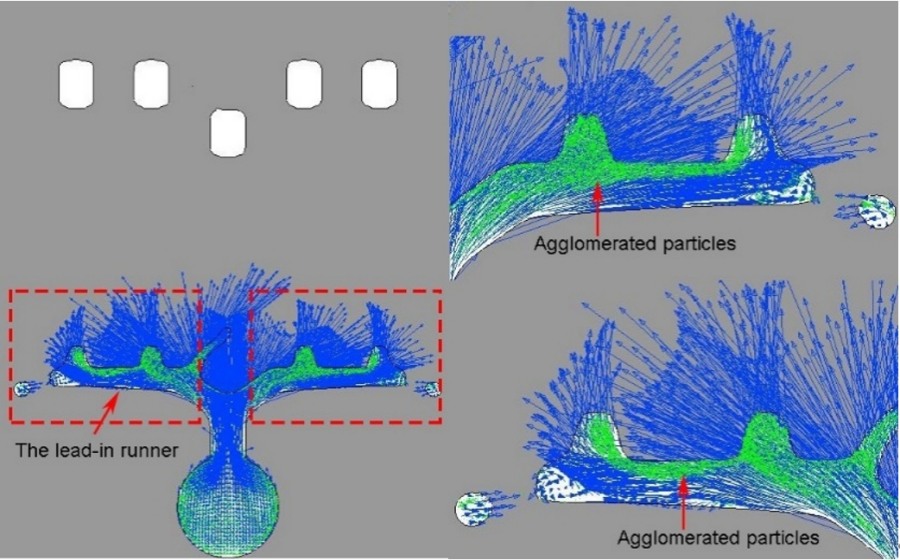 (c)試件 (d)溢流槽 3.結(jié)論 (1)基于分散相粒子模型,構(gòu)建了B4C/A356復(fù)合材料壓鑄成形過程的多相流數(shù)學(xué)模型,不同位置處顆粒分布形態(tài)的模擬結(jié)果與試驗相符合,可為PAMCs鑄造成形工藝優(yōu)化以改善組織與性能提供數(shù)值模擬方法。 (2)充型過程中溢流槽內(nèi)所形成的局部環(huán)流,增大了顆粒發(fā)生碰撞的幾率,導(dǎo)致顆粒團聚;不同位置的溢流槽內(nèi)形成了數(shù)目不等的局部環(huán)流,其數(shù)目的增大將加劇顆粒團聚與分布不均現(xiàn)象。 (3)分流道內(nèi)熔體流向發(fā)生劇烈變化易將顆粒推向某一側(cè),造成顯著的分布不均現(xiàn)象,分流道末端所形成的局部環(huán)流能夠?qū)㈩w粒截留,并促使大量顆粒發(fā)生碰撞團聚,導(dǎo)致其內(nèi)部顆粒數(shù)量較大且團聚明顯。