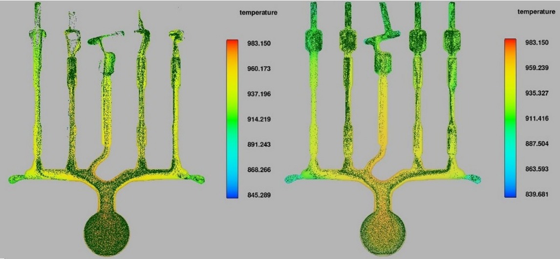 式中,μc為復(fù)合材料粘度,ρc為復(fù)合材料密度,u為熔體速度,?為普朗特流體混合長度,x為流體離型壁的距離。本研究中壓室與內(nèi)澆口截面積比為32:1,模擬結(jié)果顯示熔體通過內(nèi)澆口后速度急劇增大(見圖8a),產(chǎn)生強大的流體剪切力能夠?qū)㈩w粒團簇破碎分散。不同的是,數(shù)值模擬過程未能考慮復(fù)合材料熔體攪拌制備過程中所產(chǎn)生的顆粒團簇現(xiàn)象,因而壓室與分流道內(nèi)不存在大尺寸的顆粒團簇。此外,尚未探討顆粒對熔體粘度、導(dǎo)熱系數(shù)及熱焓等的影響,因此,后續(xù)研究將結(jié)合實驗調(diào)整上述相關(guān)物理性參數(shù),對所構(gòu)建的數(shù)學(xué)模型進行優(yōu)化。