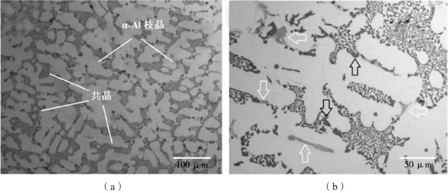 表1 鋁合金化學成分 wB/% 1.2 熱處理工藝 從鑄錠上切取10 mm×10 mm×6 mm的小塊,進行T6熱處理工藝優化,步驟如下。 (1)第一階段固溶處理優化。采用STA499C綜合熱分析儀,在氬氣保護下,從室溫至700 ℃范圍對鑄造鋁硅合金進行動態升溫測試,升溫速度為10 ℃/min。根據差熱曲線確定合金的相變溫度。 根據差熱分析,第一階段的固溶處理溫度采用495 ℃,固溶時間分別為0.5h、4h、5h、6h。再對固溶處理的試樣進行差熱分析,確定共晶相的均質化和溶解所需的最小時間。接著,把部分固溶處理過的試樣在60 ℃的水中淬火處理,然后進行200 ℃、2 h的時效處理。 (2)第二階段固溶處理優化。把經過第一階段的固溶處理后未進行時效處理的試樣進行第二階段的固溶處理,處理溫度分別為515 ℃、530 ℃,處理時間分別為2h、4h、6h、8h。接著,把進行完第二階段固溶處理的部分試樣進行60 ℃的水淬處理,然后進行200 ℃、2 h的時效處理。 (3)人工時效優化。經過第二階段固溶處理后未進行淬火處理的試樣在60 ℃的水中淬火處理,隨后進行人工時效處理,處理溫度分別為190 ℃、200 ℃、210 ℃,處理時間分別為1h、2h、4h、6h、8h。 1.3 金相和力學性能檢測方法 力學性能采用布氏硬度(北京金洋DHB-3000A 電子布氏硬度計)進行表征,按照GB/T 231.1標準執行。金相試驗采用上海光學儀器生產的9XF金相顯微鏡和場發射掃描電鏡(德國的場發射GeminiSEM 500掃描電鏡)進行分析,用0.5% HF溶液對研磨和拋光后的試樣進行化學腐蝕。 2、試驗結果及討論 2.1 第一階段固溶處理工藝優化 圖1a所示為鑄態的鋁合金組織,從圖中可以看出,鑄態鋁硅合金組織中由共晶硅顆粒與α-Al枝晶組成。α-Al基體組織中還觀察到一些不規則的粒子,如圖1b黑色箭頭所示,這可能是冷卻過程中從枝晶向預先存在的Si粒子反向擴散的結果。如圖1b中白色箭頭所示為枝晶間的一些金屬間化合物,并采用掃描電鏡對其進行了分析,如圖2所示。