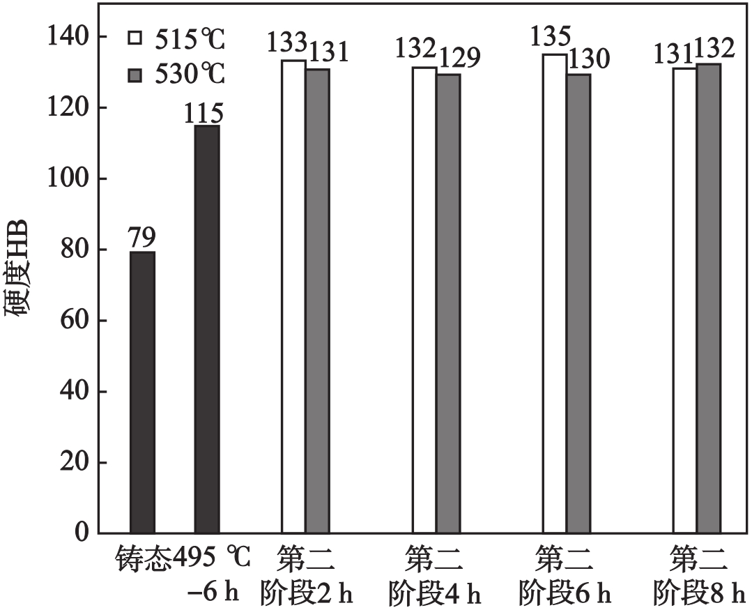 經過第二階段固溶處理后,再進行200℃時效處理2h,所得試樣的硬度數值如圖7所示。從圖7可以看出,鑄態時硬度為HB79,而經過第一階段495 ℃固溶處理6h后,隨著θ-Al2Cu相的溶解,硬度明顯提高很多,達到HB115。再通過第二階段固溶處理(515℃或530℃),由于含Cu/Mg相的進一步溶解,試樣的硬度在第二階段所有情況下都進一步增加,另外從微觀組織也可以看出,第二階段固溶處理的溫度與時間對組織影響并不明顯,因而對合金的硬度影響也并不明