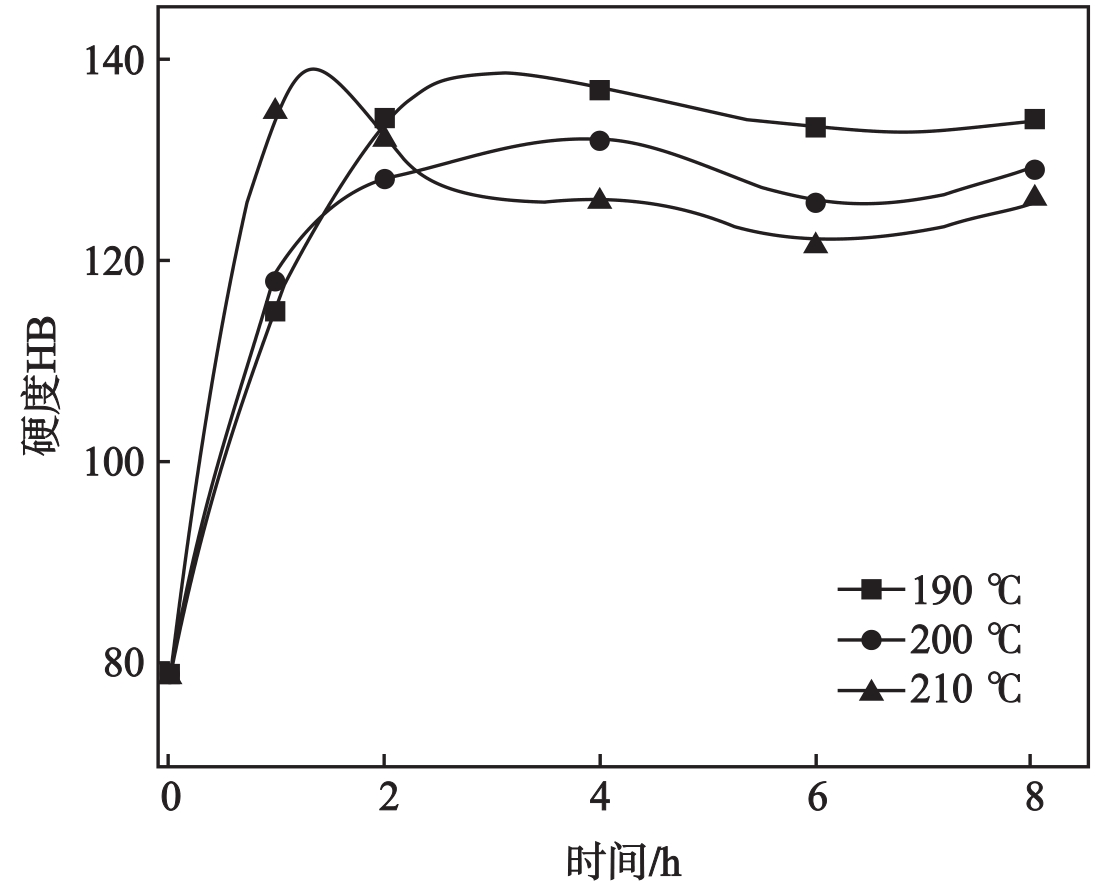 圖7 第二階段固溶處理后試樣的硬度變化圖 2.3 人工時效工藝優化 圖8所示為不同人工時效處理后試樣的硬度變化曲線圖,其中人工時效工藝是在完成固溶處理第一階段(495℃-6h)與第二階段(515℃-2h)后進行的,水淬處理都是在60℃的水中進行。從圖中可以看出,人工時效超過2h以后,試樣的硬度峰值開始下降。而當人工時效溫度為210℃時在0~1h區間內,試樣硬度曲線的斜率明顯要高,說明合金試樣在此溫度下經過人工時效會在更短的時間內達到峰值硬度。從190~210℃對應的硬度曲線斜率逐漸增加,說明合金試樣達到峰值硬度的時間逐漸縮短,其中當人工時效溫度為210℃時,試樣硬度達到峰值后隨著時間的增加有明顯下降趨勢,這主要是由于時效析出強化相粗化導致。當時效溫度為190℃與200℃時,隨著時間的增加,試樣的硬度值變化不大。人工時效處理工藝最終選擇190℃-4h即可。