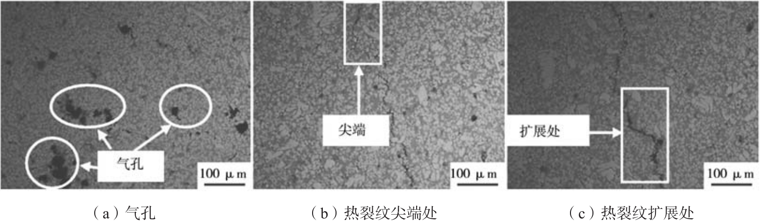 表2 圖2中各點的EDS分析結果 wB/% 2.2 合金的組織分析 圖3為在光學顯微鏡下觀察到的熱裂紋位置處的合金顯微組織,其金相組織由初生α-Al、α-Al+共晶硅相組成,淺顏色為基體組織,深顏色為共晶組織。圖中可見,熱裂紋是在合金基體相的晶界上形成和發展的,裂紋剛開始形成時,晶間分離和收縮量相對較小,共晶液容易補縮。從圖3a中可以看出,熱裂紋處分布有大量的氣孔,惡化了合金的力學性能,這與斷口形貌中觀察到的結果一致;圖3b、c中合金的晶粒大小分布不均勻,粗大的樹枝晶與細小的球狀晶共存,大量粗大枝晶的存在導致合金的抗熱裂性能降低,表明此處在冷卻過程中受熱力學等因素影響,引起組織不均勻,并產生了較大熱應力。由于粗大的枝晶不能像等軸晶、球狀晶那樣容易滑移而減少應力,所以容易發生熱裂。圖3b為熱裂紋尖端處的組織,其中一部分裂紋在形成過程中部分已經被共晶液填充補縮,一部分由于剩余共晶液體不足,并不能使裂紋填充補縮,所以導致裂紋斷斷續續。熱裂紋形成后,由于ADC12合金的凝固區間較窄,當合金液的溫度快速下降時,凝固速度加快,固相所占比例快速增加,導致合金液的充型能力大大下降,從而無法再對形成的熱裂紋進行填充補縮,而且共晶液數量少于裂紋所需要的補縮量,致使熱裂紋已經無法愈合,因此熱裂紋進一步擴展,圖3c為熱裂紋擴展后的組織,可見裂紋寬度明顯增加,最寬處達20 μm。