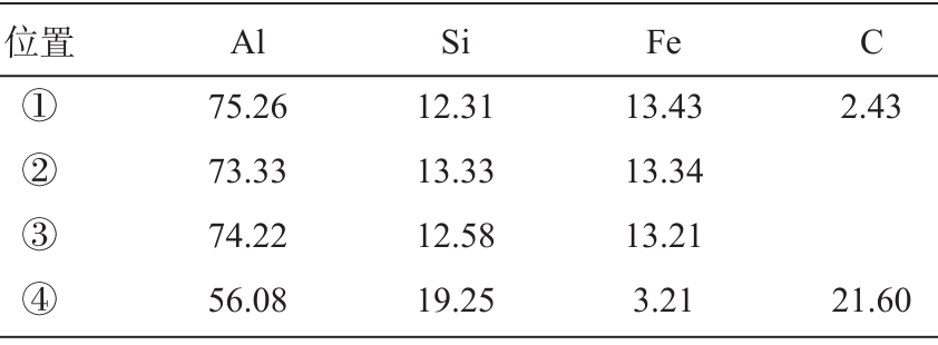 圖3 熱裂紋處合金的顯微組織 為進一步分析熱裂處的微觀組織形貌,對合金試樣進行掃描電鏡觀察,并對熱裂紋處的特征部位進行能譜分析,結果分別如圖4及表3所示。可知微觀組織中白色塊狀及針狀組織的成分含有鋁、硅、鐵元素,判斷為β(Al 9 Fe 2 Si 2 )脆性相,大量尺寸較大的塊狀β-AlFeSi相在裂紋兩側,且分布雜亂無章,阻塞了枝晶之間的補縮通道,使共晶液補縮較為困難,同時增加氣孔缺陷,因為β-AlFeSi相有著較小的氣體-固體界面能,所以氣孔容易沿著β鐵相形核并長大。另外,粗大的有害鐵相會對合金的補縮造成影響,阻塞了液體補縮的通道,因而進一步增加合金的熱裂傾向 。