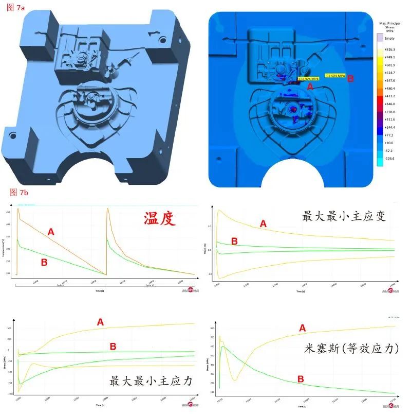 圖7 最大主應力結果與應力曲線結果 如圖7a右圖所示,在模具表面取A,B兩點。其中A點為缺陷位置,B點為無缺陷位置,結果顯示A點的最大主應力大于B點。結合應力曲線結果可以觀察到,A點的溫度高于B點,A點的最大最小主應力差值大于B點,最大最小主應變和米塞斯應力曲線結果也呈現相同情況。 缺陷判斷結果小結:應力結果,應力曲線結果等。