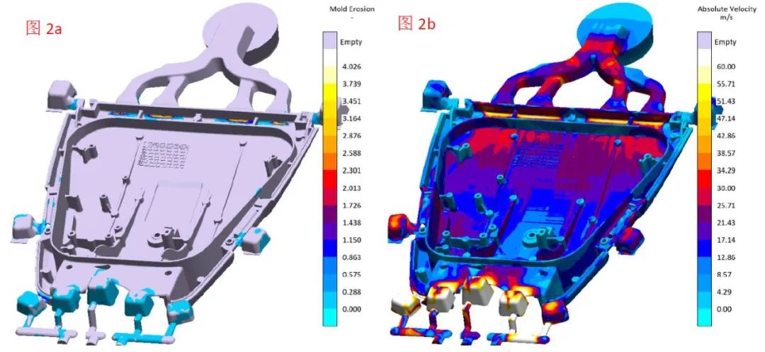 如圖1所示,金屬液充型過程中內澆口速度相對過高,且長時間對模具進行沖擊,造成模具表面出現凹凸不平的坑洼狀,映射到產品對應位置呈現出聚集顆粒狀不平表面。 圖2 沖蝕結果與成型速度結果 針對于此種類型的失效形式,在MAGMASOFT®中首先可以通過沖蝕結果進行快速甄別。如圖2a所示,圖片中高亮位置為軟件預判的缺陷位置,模擬結果與實際缺陷位置相對應。然后通過成型速度結果進行輔助驗證,如圖2b所示,沖蝕位置速度結果呈高亮顯示,表示其充型速度相對較高。(針對于不同材料性能上的差異,可以在軟件中設定不同的臨界速度值)