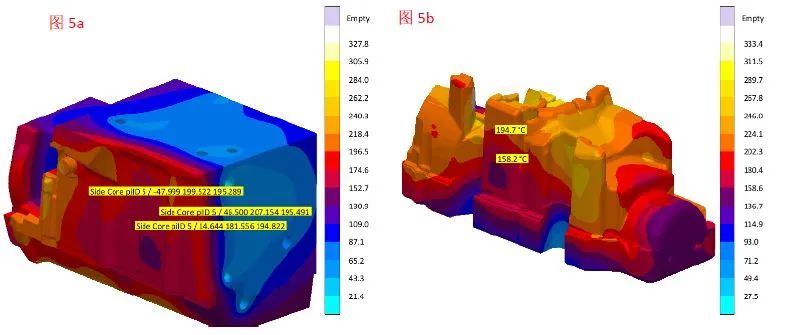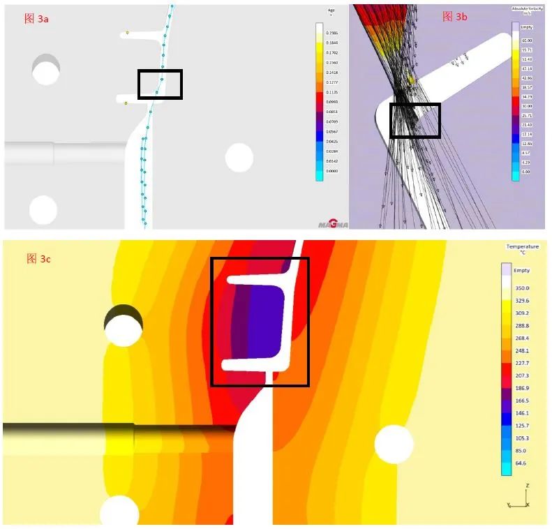 圖4 缺陷圖片 通過觀察模具溫度模擬結果(圖5a)缺陷位置對應的模具呈現表面溫度高,背溫低的狀態(tài),出現了巨大溫度差。