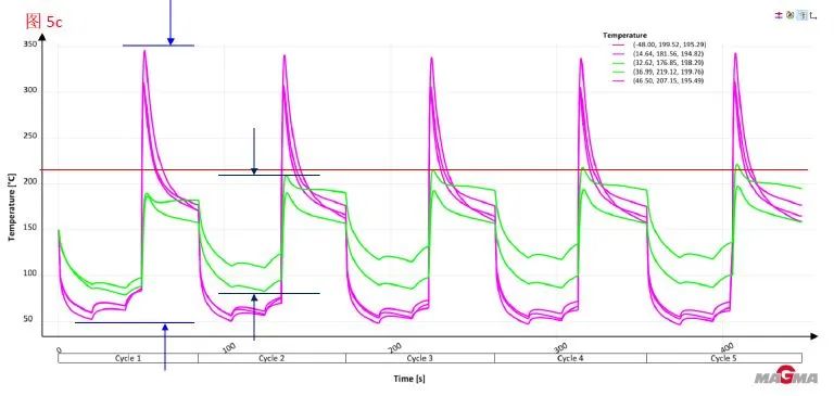 圖5 模具溫度結果與溫度曲線結果 同時,如圖5c所示,一共5條曲線,三條紫色曲線為缺陷模具表面取點生成,兩條綠色曲線為無缺陷模具表面取點生成,圖片顯示了5個生產循環(huán)。通過觀察曲線的變化規(guī)律可以發(fā)現,在每個生產循環(huán)中,缺陷模具表面的溫度曲線變化劇烈。 缺陷判斷結果小結:模具溫度結果,溫度曲線結果等。 對策:提高模具材料的硬度,強度,韌性,延展性,導熱性均可改善龜裂現象。