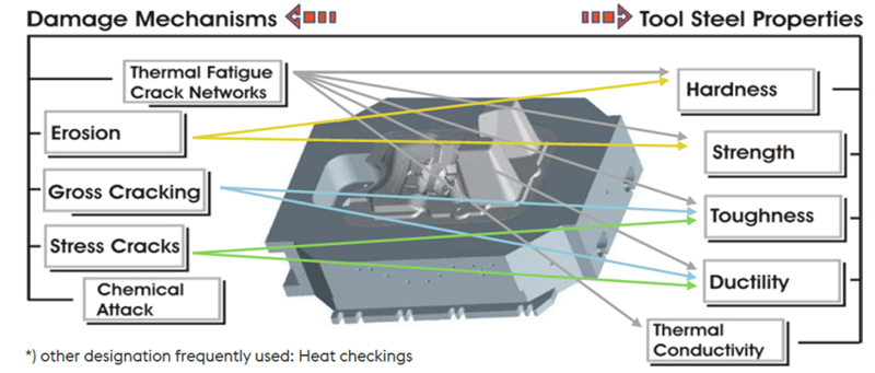 在模具溫度場無法達到較理想狀態(tài)的生產條件下,Bohler W400VMR +氮化/涂層,高韌性、高延展性材料輔以表面處理可以提高抵抗疲勞裂紋出現的能力。