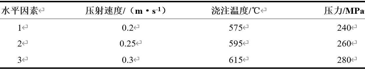 在鋁合金半固態(tài)流變壓鑄成形過程中,壓射速度、澆注溫度和壓力對鑄件本體組織和拉伸性能有較為顯著的影響。為通過較少的試驗量探索壓射速度(0.2~0.3 m/s)、澆注溫度(575~615 ℃)和壓力(240~280 MPa)對鑄件的平均晶粒尺寸、平均形狀因子、屈服強(qiáng)度、抗拉強(qiáng)度和伸長率的影響,采用正交法進(jìn)行試驗方案設(shè)計,比較了各工藝參數(shù)的重要性,并確定最優(yōu)工藝。正交設(shè)計因素水平表見表1。