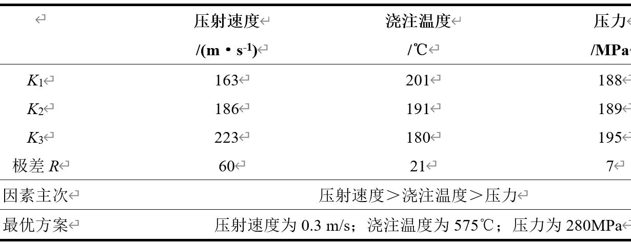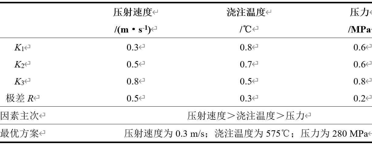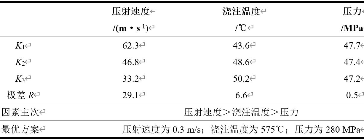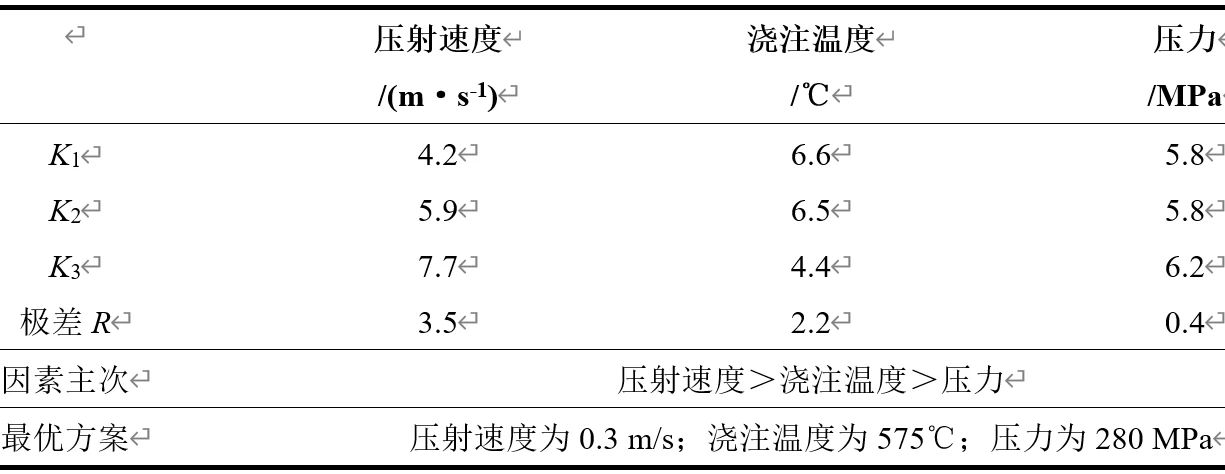 (2)通過正交試驗設(shè)計法,研究了工藝參數(shù)對組織與力學(xué)性能的影響。在試驗條件下,工藝參數(shù)對本體組織和力學(xué)性能影響的重要性順序為:壓射速度>澆注溫度>壓力;優(yōu)化的成形工藝,壓射速度為0.3 m/s,澆注溫度為575 ℃,壓力為260 MPa。