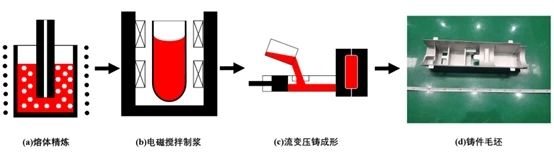 圖1 Al-Si-Mg鋁合金構(gòu)件半固態(tài)流變壓鑄成形流程示意圖及鑄件
