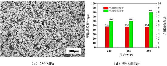 圖8為Al-Si-Mg鋁合金半固態(tài)流變壓鑄件在壓射速度為0.3 m/s、澆注溫度為595 ℃,不同壓力(240、260、280 MPa)條件下的金相組織及其變化,見圖8。研究表明,增大壓力對球狀晶的形成有促進(jìn)作用[13]。可以看出,隨著壓力增加,薔薇狀晶粒逐漸被球狀晶所替代。當(dāng)壓力為240 MPa時,平均晶粒尺寸為47.7 μm,平均形狀因子為0.6,晶粒主要呈薔薇狀;當(dāng)壓力提升至260 MPa時,部分薔薇晶演變?yōu)榍驙罹В揖Я3叽缑黠@減小,平均晶粒尺寸和平均形狀因子分別為47.4 μm和0.6;當(dāng)壓射速度提升至280 MPa,球狀晶明顯增多,平均晶粒尺寸和平均形狀因子達(dá)到47.2 μm和0.8。