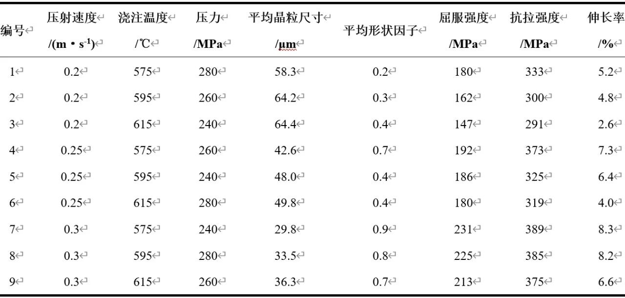 表3 Al-Si-Mg鋁合金半固態(tài)構(gòu)件正交試驗方案與結(jié)果