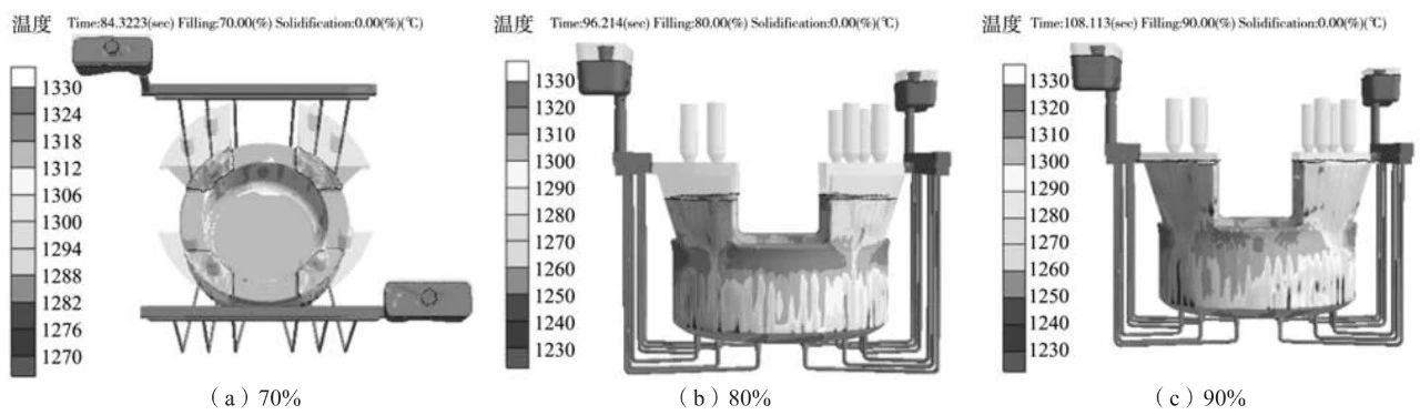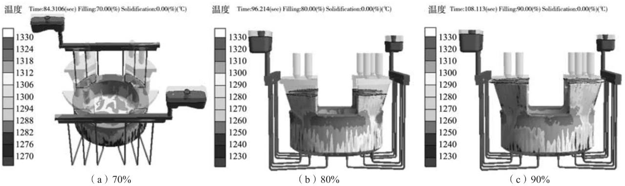 圖3 充型速度場 2.2.2 充型溫度場模擬 圖4為充型溫度場的仿真結果,從圖中可以看出,充型至70%時,底腳最低溫度為1 318 ℃,溫降為12 ℃;充型至80%時,底腳側面最低溫度為1 290 ℃,溫降40℃;充型90%時,底腳側面最低溫度為1 280 ℃,高于液相線溫度1 187 ℃,所以充型良好。