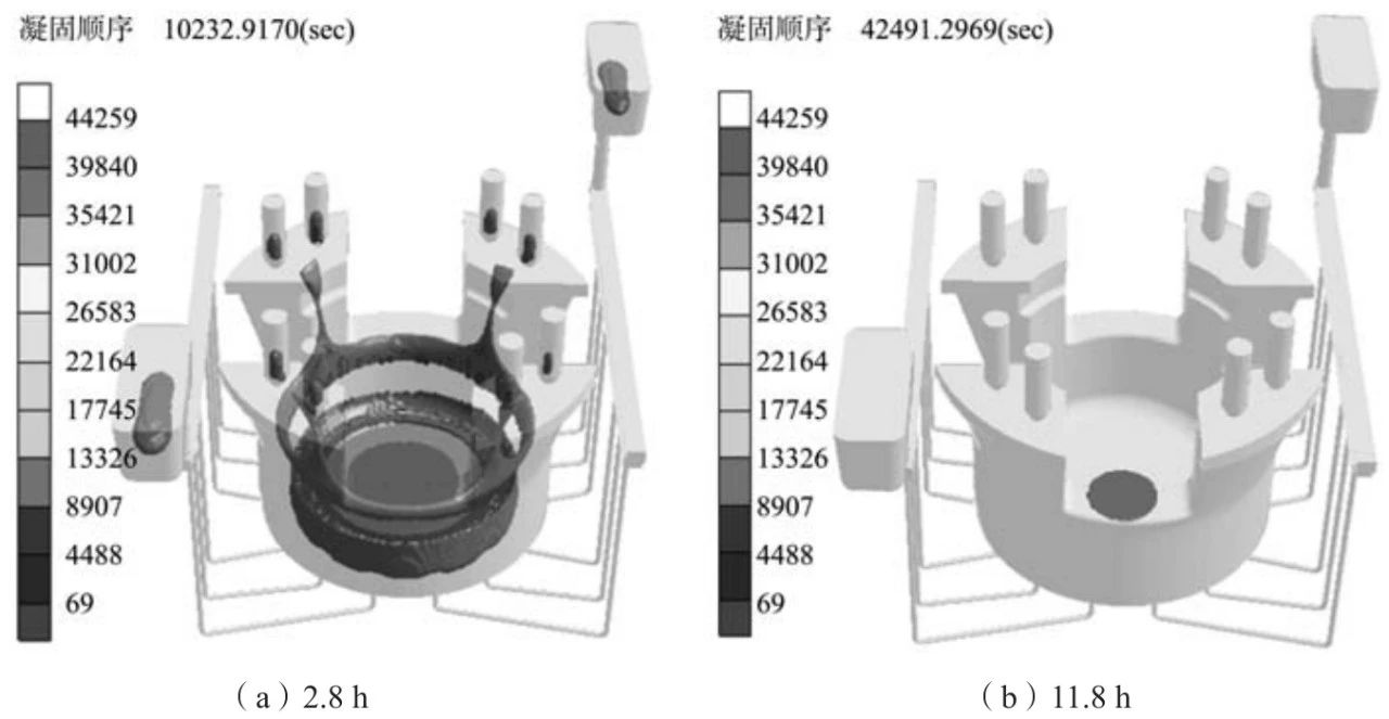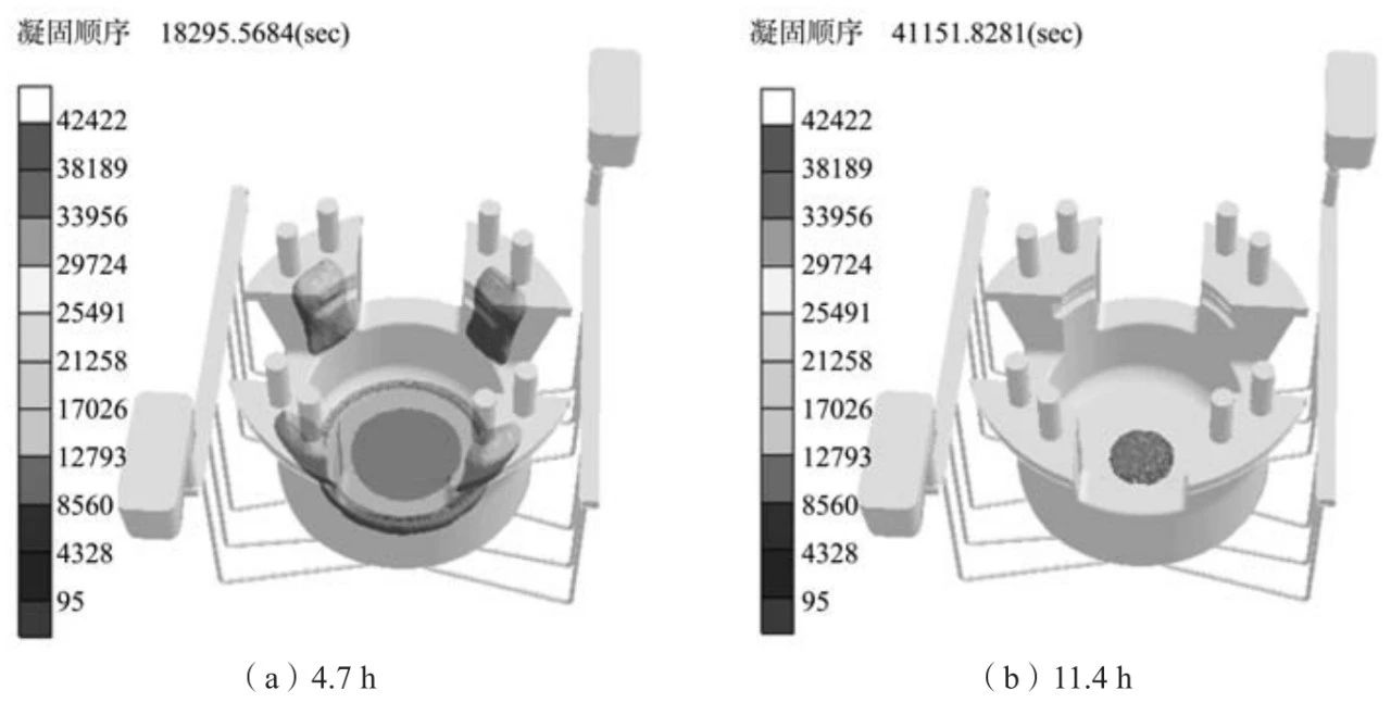 圖10 充型溫度場 2.3.4 凝固過程模擬 圖11為凝固過程的仿真結果。可見冒口先于底腳凝固,冒口補縮效果良好,最后凝固位置如圖11b所示,此處為孤立液相區。