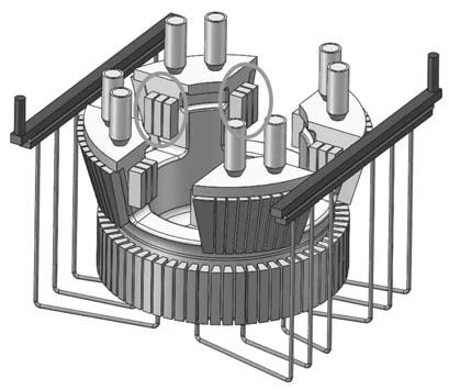 圖1 活塞鑄件三維圖 1.2 初始鑄造工藝 球墨鑄鐵活塞鑄件采用呋喃樹脂砂造型、半封閉式澆注系統,澆注系統各橫截面面積的比例為:直澆道∶橫澆道∶內澆道=1∶1.65∶0.96。兩包澆注,兩個Φ100 mm直澆道,兩條130 mm×100 mm橫澆道,12根Φ40 mm內澆道,8個Φ180 mm發熱冒口,4個底腳四周放置專用冷鐵,其余位置放置方冷鐵,其工藝三維圖如圖2所示。鐵液澆注溫度在1 320~1 340 ℃,出液前靜置5~8 min,鑄件毛坯重量26 000 kg,澆注重量為31 000 kg,澆注后10天開箱。