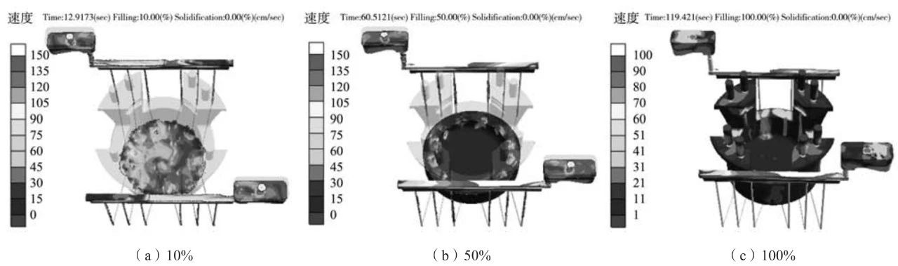 圖8 鑄造工藝優化 2.3.2 充型速度場模擬 圖9為充型速度場的仿真結果。從圖中可以看出,金屬液首先充填底部,然后往上充填,底腳為最后充填位置,經過120 s完成鑄件的整體充型。通過分析云圖可以得知,充型10%時,鐵液底部稍有起伏,有輕微不平穩現象,速度最高為135 cm/s;充型至50%,速度有所降低,最高為120 cm/s;充型結束時,鐵液速度變為平穩,最高為100 cm/s。相比于首次,速度降低。