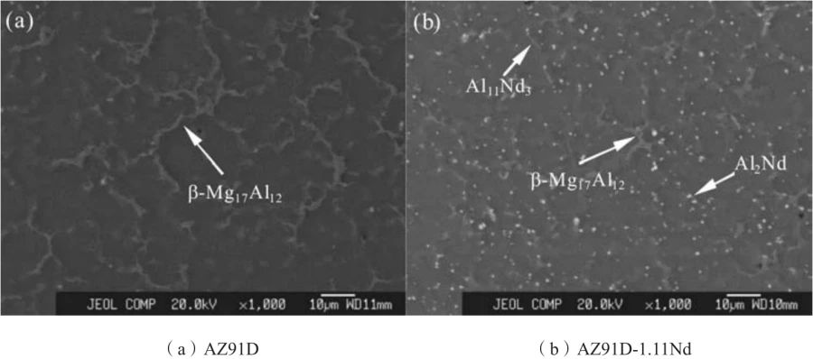 圖3 壓鑄態AZ91D與AZ91D-1.11Nd合金的金相照片 圖4為AZ91D和AZ91D-1.11Nd合金壓鑄試樣的SEM照片。可見,AZ91D合金的微觀組織主要由黑色α-Mg基體和灰色β-Mg17Al12組成,β-Mg17Al12呈網狀沿晶界分布。AZ91D-1.11Nd合金的微觀組織主要由黑色α-Mg基體、灰色β-Mg17Al12和大量亮色的粒狀和少量針狀相組成,β-Mg17Al12呈網狀沿晶界分布,亮色細小顆粒狀和針狀相在晶界和晶粒內彌散分布,網狀的β-Mg17Al12被打斷且粒徑減小。