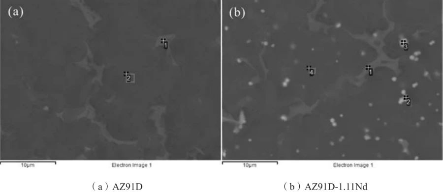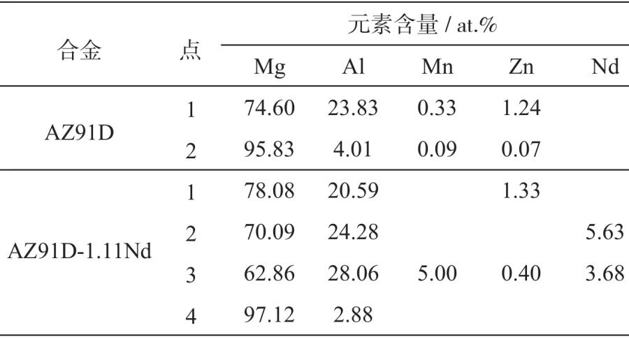 圖4 壓鑄態AZ91D與AZ91D-1.11Nd合金的掃描電鏡照片 圖5通過EDS標記了兩種合金不同相位置的點對第二相粒子分析,結果如表1所示。基體中沒有檢測到Nd,亮色相中檢測到Nd存在,AZ91D-1.11Nd合金基體中固溶元素含量低于AZ91D。結合XRD分析結果及相關文獻可知亮色顆粒狀相主要為Al2Nd,針狀相為Al11 Nd3。Nd、Mg和Al的電負性分別為1.14、1.31和1.61,Nd與Mg、Al之間的電負性差值分別為0.17和0.47,因此Al和Nd之間的電負性差值更大,加入Nd后在熔體凝固過程中Al-Nd相會優先析出,抑制了低熔點β-Mg17Al12的析出,同時β-Mg17Al12的體積及粒徑減小。