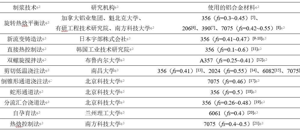 表1 高固相含量流變制漿技術 近年來,漿料制備技術的相關研究主要集中在解決非亞共晶Al-Si系鋁合金的漿料制備難題上。在漿料制備過程中,接近散熱通道的熔體冷卻較快,遠離散熱通道的熔體冷卻較慢,因而漿料內部不可避免存在溫度差異,也存在固相含量差異。圖1為不同鋁合金的固相含量隨溫度的變化曲線。可以看出,在40%~50%固相含量區間,7075鋁合金(非Al-Si系)的曲線斜率大于356鋁合金(Al-Si系),即7075鋁合金的固相含量對溫度變化更敏感。因而,非亞共晶Al-Si系鋁合金半固態漿料的制備對漿料溫度場均勻性控制提出了更高的要求。