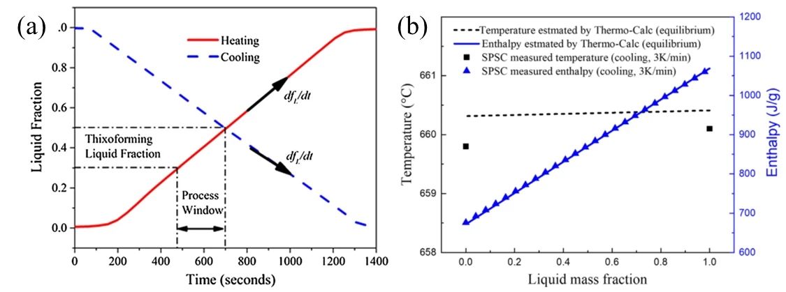 表2 部分高固相流變壓鑄成形鋁合金的力學性能 研發工藝專用新材料首先要解決的問題是,判斷合金是否適用于流變壓鑄成形工藝。ATKINSON H V提出流變成形合金適用的關鍵因素是合金的液相含量與溫度曲線在指定液相含量下的斜率。但是,CURLE U等完成了高純鋁和共晶Al-Si合金的流變壓鑄成形,對該準則提出了挑戰。隨后,ZHANG D等提出新的判斷方法,用合金的液相含量與制漿時間曲線作為判斷依據,見圖4a。HU X G等從合金凝固焓變的角度出發提出新的判斷方法,用液相含量與焓變曲線作為判斷依據,見圖4b。這兩種判斷方法擴充了工藝使用材料的成分范圍,為非亞共晶Al-Si系合金的設計提供了指引。