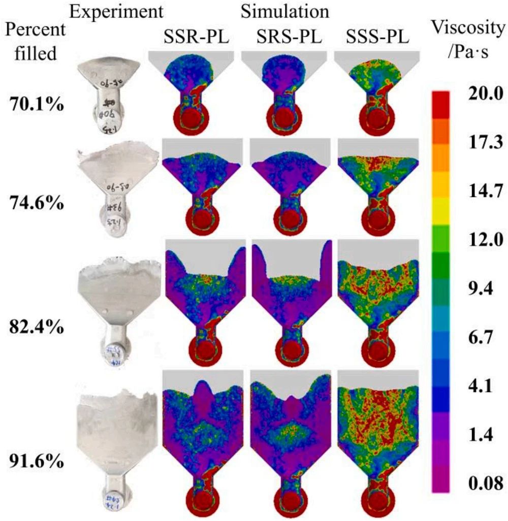 表3 部分SEED流變壓鑄成形用高性能鋁合金的性能 3、流體建模與模擬仿真 模流分析是輔助模具設計的重要手段,準確的流體模型是實現精準模流分析的基礎。關于半固態流體模型的研究是伴隨著半固態技術誕生開始的,先后有近20種數學模型被用于描述半固態流體的流變特性,這些模型可以被分為單相流模型和多相流模型。 單相流模型方面,冪律模型(Power-Law)和赫-巴模型(Herschel-Bulkley)因為形式簡單、易于求解,已經被廣泛應用到計算機模擬仿真中。近年來的相關研究集中在如何提高模型準確度的問題上。董恩潔研究了測試系統幾何結構和Taylor渦對雙筒流變儀測量精度的影響,并提出測量系統改進設計方案。陳娟研究了固相顆粒體征對半固態漿料流變特性的影響,并建立考慮固相顆粒特征的流體模型。QU W Y等采用剪切速率掃描(SSR)、穩定剪切速率(SRS)、剪切應力掃描(SSS)3種模式表征了半固態流體的流變特性,并分別擬合了冪律模型,通過對比模擬仿真結果與試驗結果發現,剪切應力掃描數據擬合模型更接近試驗結果,見圖5。雖然上述研究采用的同軸雙筒剪切法只適用于低固相半固態漿料,但是在高固相流變壓鑄成形全過程中,熔體經歷了從液態到低固相半固態、再到高固相半固態的演變,低固相條件下的半固態漿料流變特性也應該被全流程模擬仿真所考慮。在高固相漿料流變特性表征方面,HU X G等設計了平板高速壓縮測試系統,用該測試系統測量數據擬合高固相含量319s鋁合金的冪律模型,該模型對漿料流動的模擬仿真結果與試驗結果的特征相吻合,證明了模型的準確性。