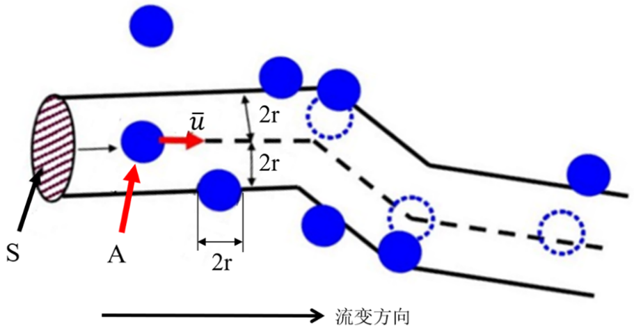 假定,①合金熔體為流體和原子團簇組成的混合物,其中的流體是與氣體類似的無規則排列和做熱運動的原子或分子體系;而原子團簇則是由若干個原子或分子組成的具有一定結構的球體(或等效于一個球體),也在做熱運動。因此,該體系可以理解為氣體(或流體)中裹挾著顆粒(晶胚)的兩相流;②合金熔體中最大尺寸的原子團簇等效半徑為r,單位體積內這樣的原子團簇數為N,在熔體中的濃度用體積分數αs表示;③原子團簇是球形的顆粒,相鄰原子團簇接觸碰撞時符合軟球模型的規律,一旦碰撞,就會合并,沒有回彈或脫離,即一個晶胚只有一次碰撞機會;④晶胚間的碰撞只有二元碰撞,即僅考慮兩兩碰撞,且只碰撞一次;⑤在流變條件下,晶胚之間的平均相對速率為