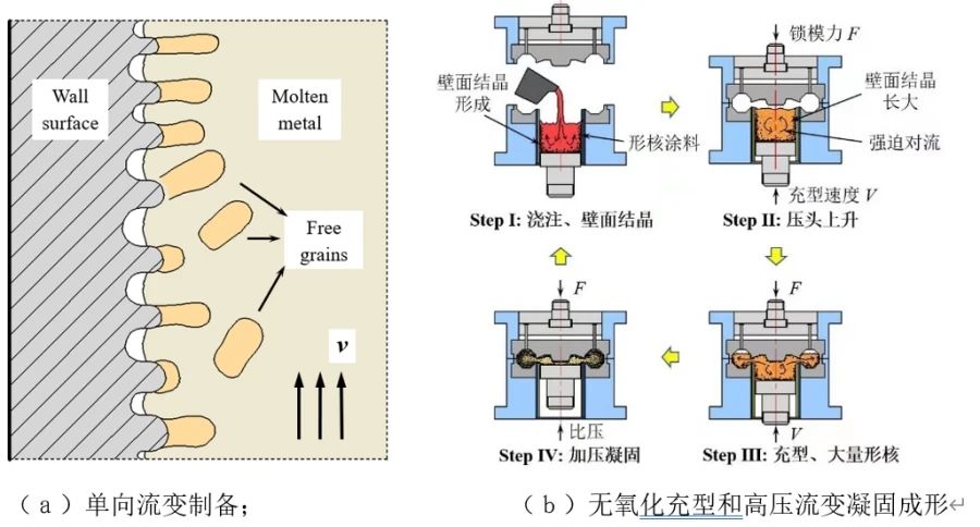 根據牛頓粘性定律 成形參數主要影響進入模腔的半固態熔體在壓力作用下的流變和凝固。成形比壓(壓強)越大,越容易使半固態熔體發生流變,進而促進流變形核和合并長大。持壓時間對單向SSMF的影響主要表現在凝固收縮能否被完全補充。如果在完全凝固前解除了壓力,則金屬的流變停止,隨后凝固產生的體積減小無從補償,便會形成縮松。 3.3 復雜隨流半固態成形技術 復雜隨流半固態成形技術集成了低壓鑄造的密閉無氧化輸送金屬液、強對流制備半固態熔體以及模鍛、壓鑄等精密成形技術,其工藝過程是液態金屬在特定的流道內進行非單向的復雜流動。流動過程液態金屬與通道之間發生熱交換,在流動的軸向和橫向都存在一定的溫度梯度,流動方向和速度不斷變化,沿著流動的過程發生初生固相的流變形核和流變長大,并進入模腔后進行高壓流變壓鑄、模鍛或擠壓等成形,見圖4。該技術是將半固態漿料制備與成形無縫連接、高度集成的半固態流變成形技術。