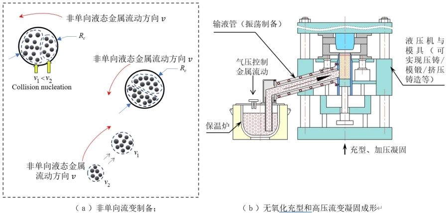 也就是說,流變會促進初生相的粗化長大。攪拌法制備半固態漿料的很多試驗也都證明,攪拌時間超過某一個臨界值,初生固相的尺寸會明顯增大。 3、隨流半固態成形技術 3.1 隨流半固態成形技術(SSMF)的概念 根據上述流變碰撞形核和流變合并長大理論,發明了隨流半固態成形技術(SSMF)。該技術是一種流變與凝固強耦合的半固態流變成形技術,在金屬液向模腔流動的過程制備出含有一定非枝晶初生固相的半固態熔體,并在密閉的惰性氣體保護下充滿模腔、在高壓條件下凝固成形,在液態金屬流變充型的過程中實現隨流形核和長大,并在隨后的半固態模鍛或鑄造的流變過程演變和剩余液相的凝固。其實現了漿料制備與工件的半固態成形制造的無縫連接,從而從根本上解決了半固態漿料制備、輸送與充型過程的氧化、吸氣等問題,縮短了傳統工藝流程,是一種材料制備成形一體化新技術,見圖2。