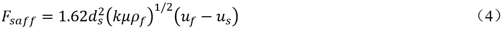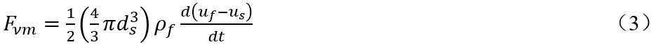 式中, 虛擬質量力Fvm也稱附加重力,是當顆粒做變速運動時,帶動周圍流體速度發生變化,除了顆粒變速運動消耗流體速度改變需要的功等同于對顆粒施加了一個“虛擬質量”,其數值等于被它排除的流體質量的一半。對球形顆粒與流體做相對變速運動時,虛擬質量力Fvm可以定量計算為: