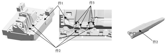 件1:動模鑲塊;件2:異形型芯;件3:推桿