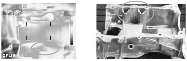 曲軸箱體壓鑄模在局部深腔處采用異形型芯鑲拼結構,簡化了模具制造難度,工藝簡單加工方便,型芯拋光后表面粗糙度小于Ra =0.4 μm,尺寸精度及外觀質量均滿足要求。模具經過大批量生產驗證,異形型芯冷卻效果良好,模具溫度穩定在工藝要求160~220 ℃,如圖5a所示。鑄件在局部深腔處沒有因模具溫度過高而產生的粘料、擦傷等外觀缺陷,如圖5b所示。異形型芯的使用壽命達到8萬模次以上,降低模具維修難度和制造成本,保證了鑄件質量。按此模具結構已復制多套模具進行批量生產,鑄件品質優良,模具運行穩定、可靠。